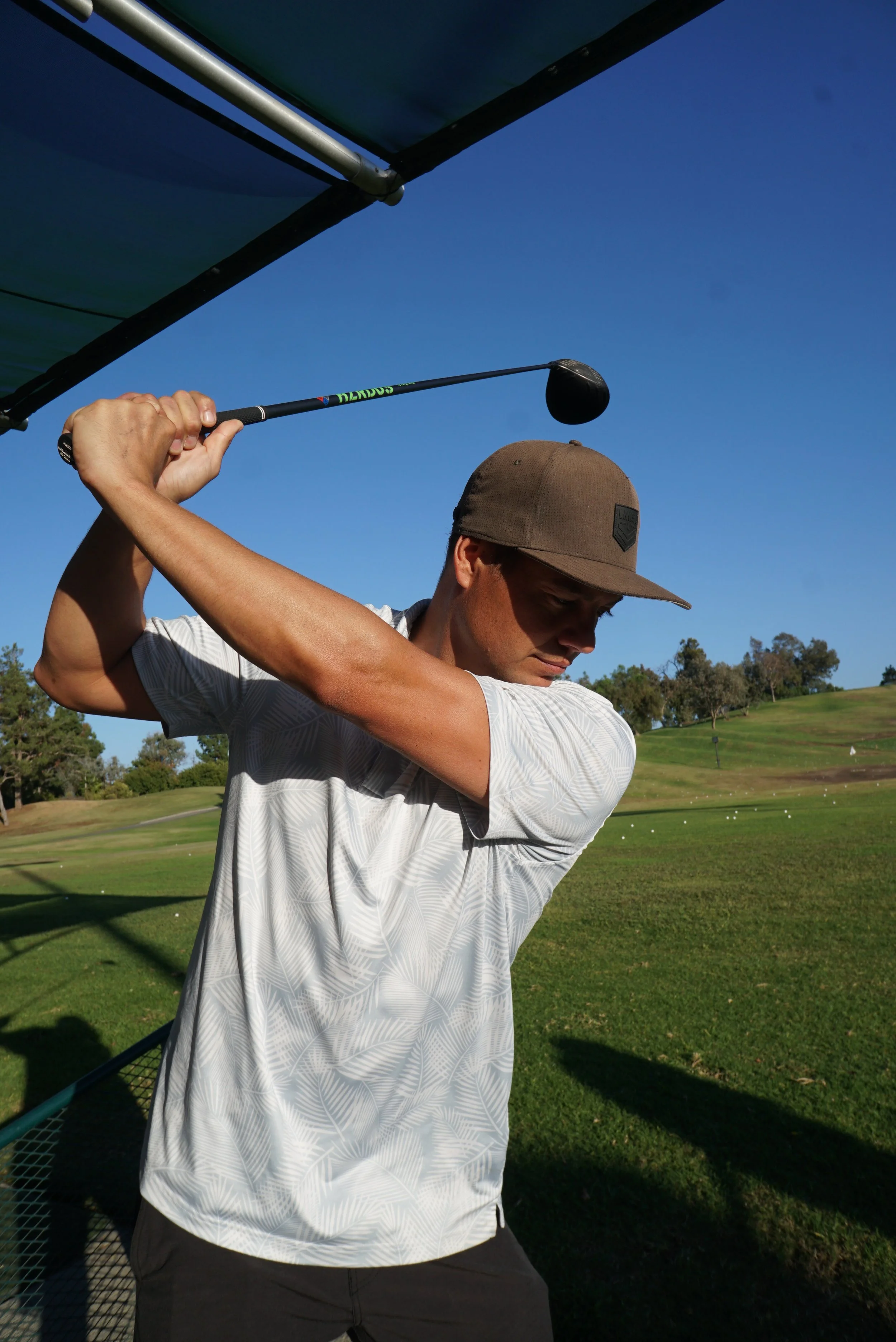 A young man in a white patterned shirt and brown cap swinging a golf club on a golf course with green grass and trees under a blue sky.