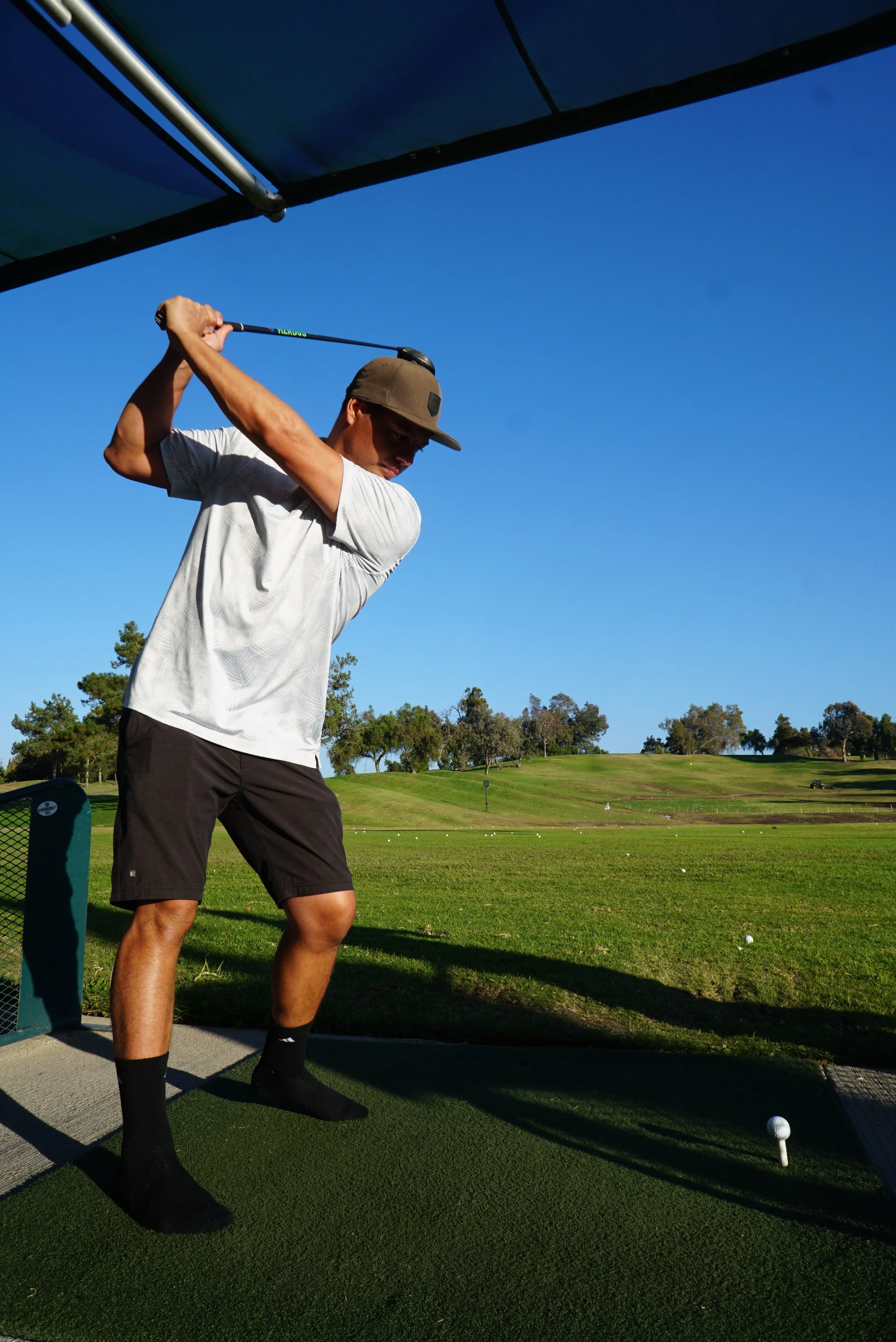 A man in a white T-shirt, black shorts, and a hat playing golf, swinging a golf club at a driving range with a clear blue sky and green trees in the background.